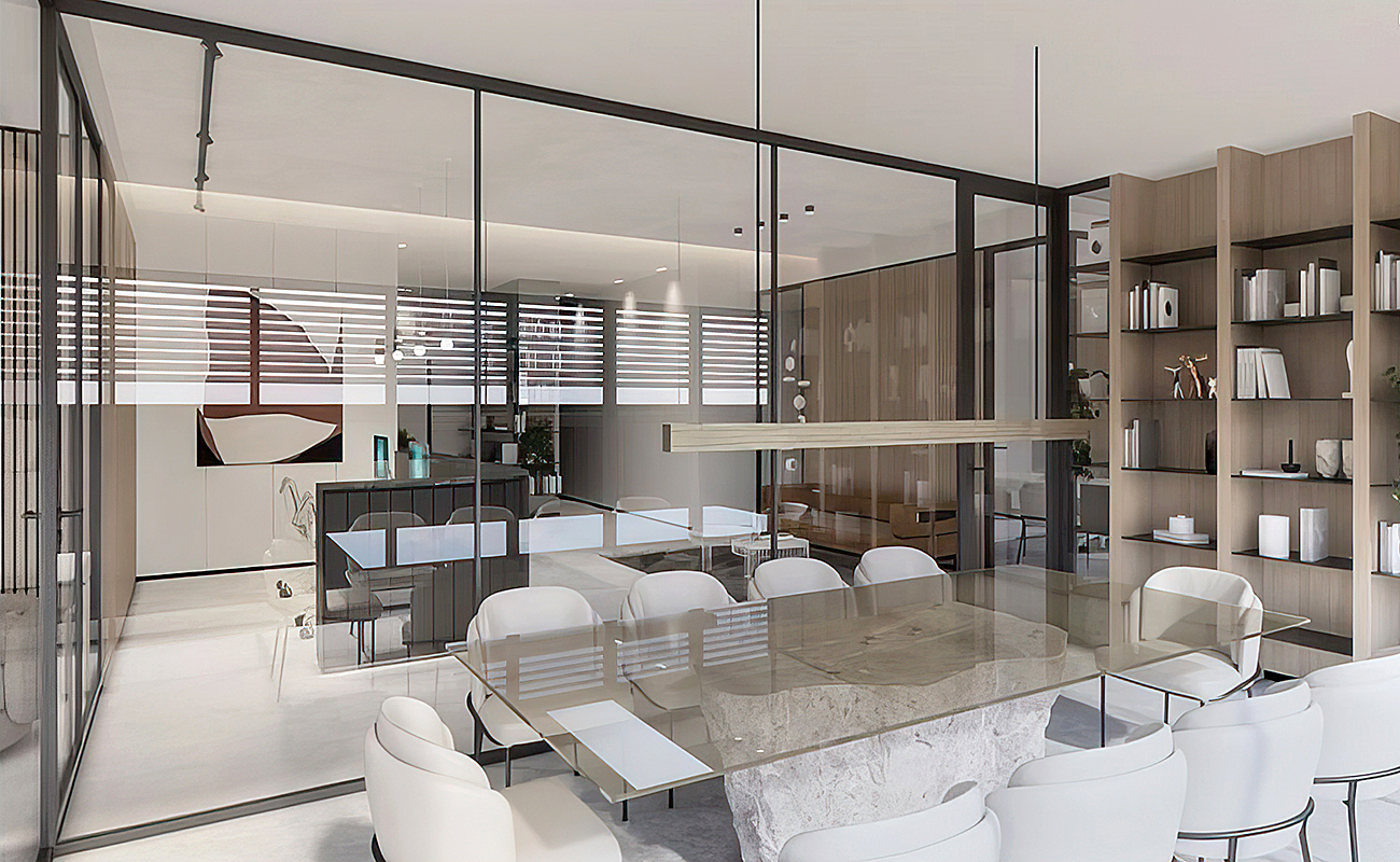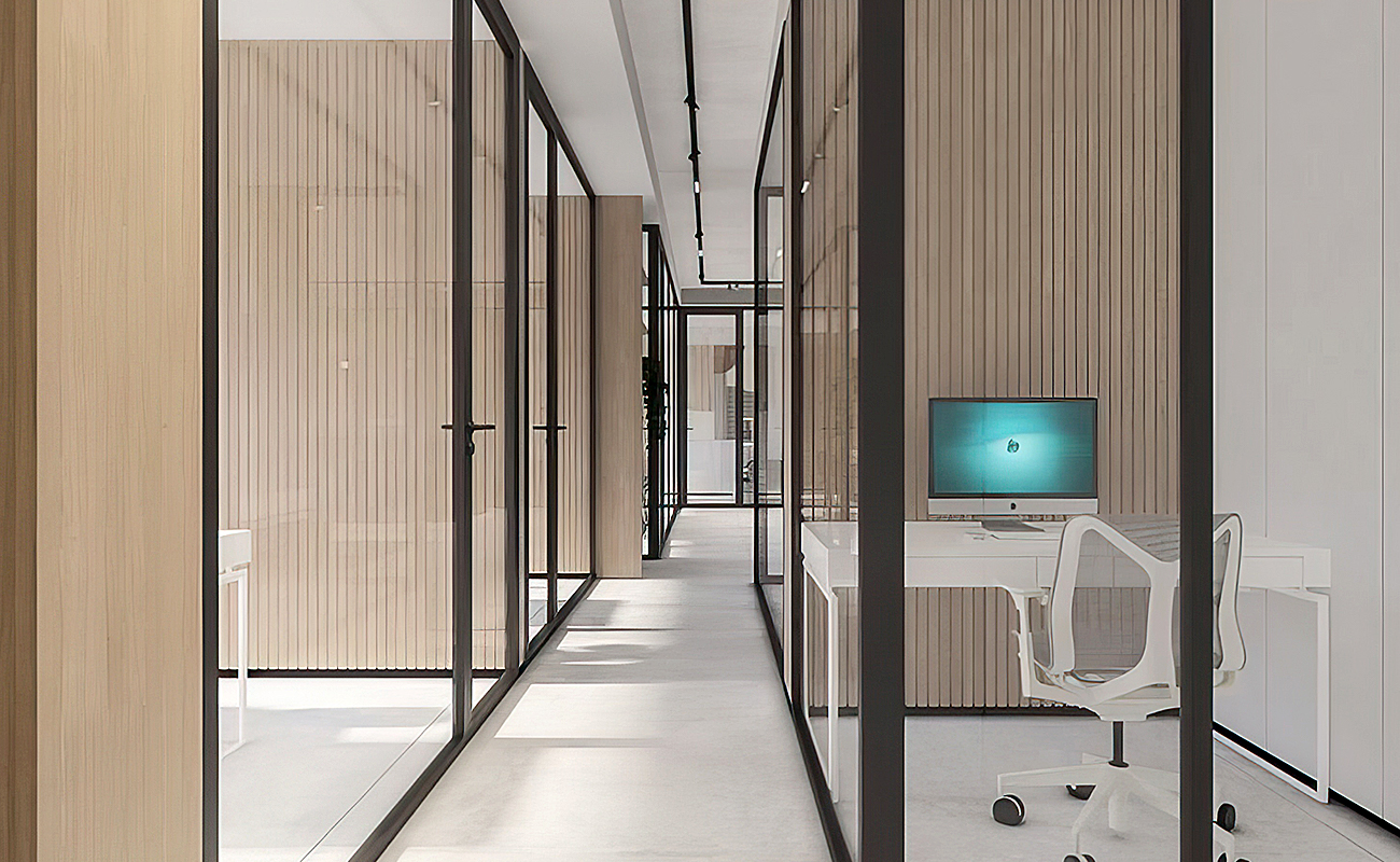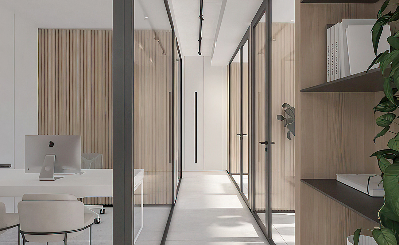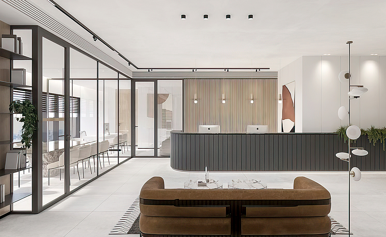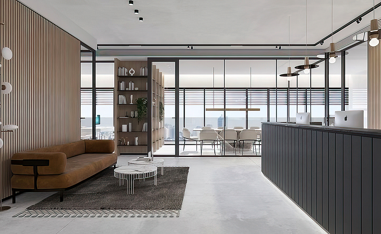 פרקט עץ בחדרים שילוב של אריחי בטון במעברים , קירות זכוכית בשילוב פרופיל אלומיניום של אינוווייט , תאורה מדהימה ויוקרתית של "קימחי תאורה" , 5 חד' עבודה+ חדר ישיבות+ חדר ארכיב + מטבח גדול + קבלה והמתנה מרווחת , משרד שחובה לראות !